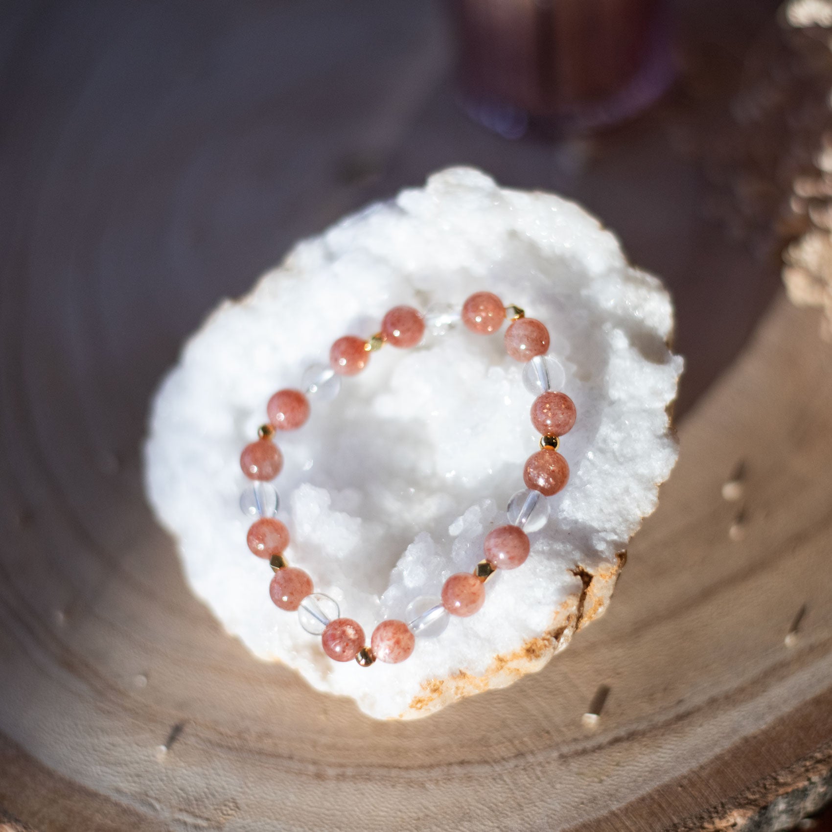 Nous vous proposons ce bracelet en pierre du soleil et cristal de roche. La pierre du soleil apporte joie de vivre, et apaise les incertitudes.