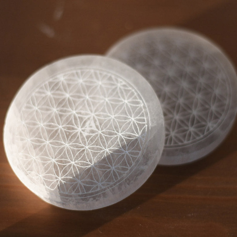 Nous vous proposons un palet en sélénite pour vous permettre de recharger vos pierres grâce à la fleur de vie. La fleur de vie est une géométrie sacrée qui permet de recharger vos pierres de lithothérapie.